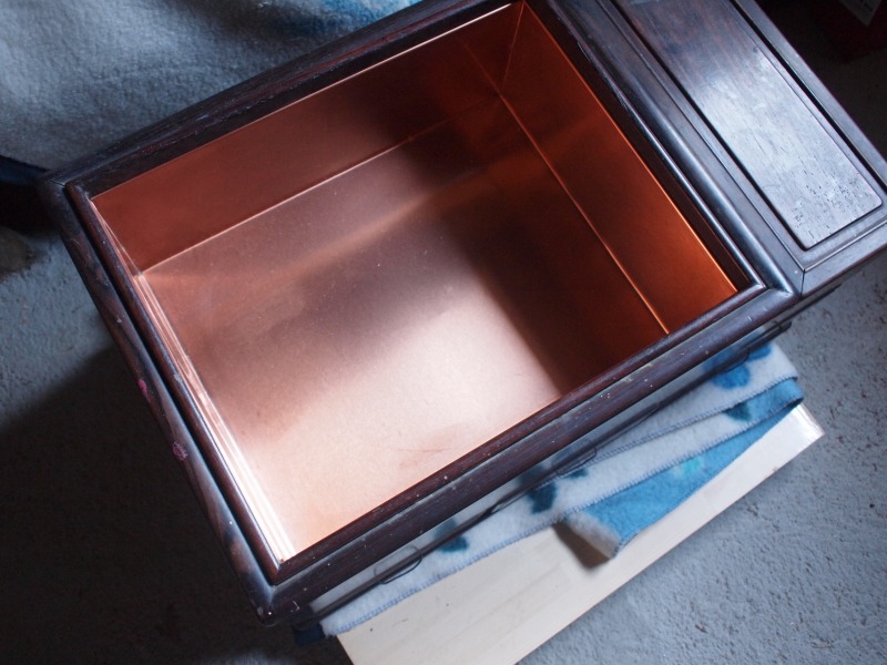 長火鉢の修復 傷んでいた火鉢の銅の内張りの張替えです。 お世話になっているこしらえ物が得意な銅板職人さんにお願いしました。 内部の底板も焦げて穴が開いていたので、不燃の板と交換して頂きました。使うのが勿体ないほど綺麗になりました。 PR (2018年02月05日・家具)